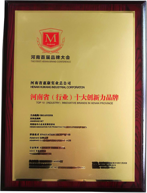 近些年來(lái)河南省在品牌建設(shè)方面的重視程度不夠,致使河南省的世界知名品牌不多。為了讓企業(yè)了解自己的行業(yè)發(fā)展地位以及自身品牌價(jià)值的變化,11月30號(hào)舉行了河南省品牌大會(huì),助力河南省打造出越來(lái)越多知名的品牌,河南惠康實(shí)業(yè)總公司榮獲十大創(chuàng)新力品牌。